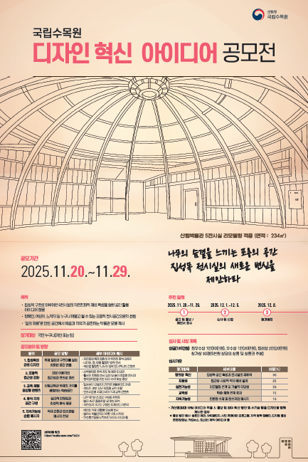 ÀÌÈïÀç ±âÀÚ : »ê¸²Ã» ±¹¸³¼ö¸ñ¿øÀÌ Àå¾ÖÀÎ µî »çȸÀû ¾àÀÚ¸¦ À§ÇÑ Æ÷¿ëÀû Àü½Ã°ø°£ Á¶¼ºÀ» À§ÇØ '»ê¸²¹Ú¹°°ü 5Àü½Ã½Ç µðÀÚÀÎ Çõ½Å ¾ÆÀ̵ð¾î °ø¸ðÀü'À» 20ÀϺÎÅÍ °³ÃÖÇÑ´Ù°í ¹àÇû´Ù.À̹ø °ø¸ðÀüÀº Áý¼º¸ñ ±¸Á¶·Î ÀÌ·ç¾îÁø 5Àü½Ã½Ç(234§³)À» ´ë»óÀ¸·Î Çϸç, ±¹¸³¼ö¸ñ¿øÀº Àå¾ÖÀÎ, ¾î¸°ÀÌ, ³ë¾àÀÚ µî ´©±¸³ª ¹èÁ¦µÇÁö ¾Ê°í ¾ÈÀüÇÏ°í Æí¸®ÇÏ°Ô ÀÌ¿ëÇÒ ¼ö ÀÖ´Â °ø°£À» ¸¶·ÃÇϱâ À§ÇØ ±¹¹Î Âü¿©Çü ¼³°è ¾ÆÀ̵ð¾î¸¦ ¸ðÁýÇÑ´Ù.°ø¸ð ÁÖÁ¦´Â '³ª¹«ÀÇ ¼û°áÀ» ´À³¢´Â Æ÷¿ëÀÇ °ø°£ - Áý¼º¸ñ Àü½Ã½ÇÀÇ »õ·Î¿î º¯½Å'ÀÌ´Ù. °³ÀÎ ¶Ç´Â ÆÀ ´ÜÀ§·Î Âü¿©ÇÒ ¼ö ÀÖÀ¸¸ç, Á¢¼ö´Â 29ÀϱîÁö ÁøÇàµÈ´Ù.±¹¸³¼ö¸ñ¿øÀº À̹ø °ø¸ð¸¦ ÅëÇØ ¡ãÁ¢±Ù¼º °È Áß½ÉÀÇ Æ÷¿ë ¼³°è ¡ã°¨¼ºÀû Áý¼º¸ñ µðÀÚÀÎ ¡ã±³À° ¹× üÇè ÄÜÅÙÃ÷ °³¼± ¡ãÄ¡À¯ ¹× ÈÞ½Ä °ø°£ ±¸¼º ¡ãź¼ÒÁ߸³ ¹× Áö¼Ó°¡´É¼º µîÀ» ÁÖÁ¦·Î ÇÑ ¾ÆÀ̵ð¾î¸¦ ¼öÁýÇÒ ........................½É»ç´Â âÀǼº ¹× Çõ½Å¼º(30%), Æ÷¿ë¼º(25%), ½ÇÇö °¡´É¼º(20%), ±³À°¼º(15%), Áö¼Ó°¡´É¼º(10%) ¼øÀ¸·Î Æò°¡µÈ´Ù. Æ÷¿ë¼º Ç׸ñÀº Àüü Æò°¡ÀÇ 4ºÐÀÇ 1À» Â÷ÁöÇϸç, ƯÈ÷ Àå¾ÖÀÎÀ» Æ÷ÇÔÇÑ »çȸÀû ¾àÀÚ¸¦ °í·ÁÇÑ ¼³°è°¡ ÇÙ½É ¿ä¼Ò·Î ¹Ý¿µµÈ´Ù. AI ±â¼ú Ȱ¿ëÀ̳ª Âü¿© È®»ê ¹æ¾ÈÀ» Á¦½ÃÇϸé ÃÖ´ë 10%ÀÇ °¡»êÁ¡ÀÌ ºÎ¿©µÈ´Ù.ÃÑ »ó±ÝÀº 135¸¸¿ø ±Ô¸ð´Ù. ÃÖ¿ì¼ö»ó 1Á¡(50¸¸¿ø), ¿ì¼ö»ó 1Á¡(30¸¸¿ø), Àå·Á»ó 2Á¡(°¢ 20¸¸¿ø), Âü°¡»ó 30Á¡ÀÌ ............................Ãâó : Çѱ¹Àå¾ÖÀνŹ® ¹«´ÜÀüÀç ¹× Àç¹èÆ÷ ±ÝÁö