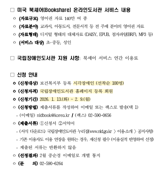 ºÏ¼Î¾î ³»¿ë (ÀÚ·á : ±¹¸³ÀçȰ¿ø)Á¤Çϸ² ±âÀÚ : ±¹¸³Àå¾ÖÀεµ¼°üÀº 1¿ù 13ÀϺÎÅÍ 2¿ù 9ÀϱîÁö ½Ã°¢Àå¾ÖÀÎÀ» À§ÇÑ ¡®ºÏ¼Î¾î ¿Â¶óÀεµ¼°ü¡¯ ȸ¿øÀ» ¸ðÁýÇÑ´Ù°í ¹àÇû´Ù.¸ðÁý ´ë»óÀº ±¹³» °ÅÁÖ ½Ã°¢Àå¾ÖÀÎÀ¸·Î, ¼±Âø¼ø 100¸íÀ» ¼±Á¤ÇØ ¿µ¾î±Ç µðÁöÅÐ ÀÚ·á ÀÌ¿ëÀ» Áö¿øÇÑ´Ù.¡®ºÏ¼Î¾î(Bookshare)¡¯´Â ¹Ì±¹ ºñ¿µ¸®´Üü º£³×Å×Å©(Benetech)°¡ ¿î¿µÇÏ´Â ½Ã°¢Àå¾ÖÀÎ Àü¿ë ¿Â¶óÀεµ¼°üÀ¸·Î, Çй®, ±³¾ç, ÀÚ±â°è¹ß µî Àü ºÐ¾ß¸¦ ¾Æ¿ì¸£´Â µðÁöÅÐ ´ëüÀÚ·á 140¸¸¿© ±ÇÀ» Á¦°øÇϰí ÀÖ´Ù. ÄÜÅÙÃ÷´Â µðÁöÅÐ À½¼ºµµ¼, ÀüÀÚÁ¡ÀÚÀÚ·á µî ´Ù¾çÇÑ ÇüÅ·Π±¸¼ºµÅ ÀÖ´Ù.±¹¸³Àå¾ÖÀεµ¼°üÀº 2012³âºÎÅÍ ºÏ¼Î¾î¿Í Çù·ÂÇØ ±¹³» ½Ã°¢Àå¾ÖÀο¡°Ô ¿µ¾î±Ç µðÁöÅÐ ÀÚ·á Á¢±Ù ±âȸ¸¦ Á¦°øÇØ ¿Ô´Ù. À̹ø ȸ¿ø ¸ðÁýÀ» ÅëÇØ ¿µ¾î±Ç ÀÚ·á ÀÌ¿ë ±âȸ È®´ë¿Í ±Û·Î¹ú Á¤º¸ Á¢±Ù¼ºÀ» ³ôÀÏ °èȹ .......................Ãâó : Çѱ¹Àå¾ÖÀνŹ® ¹«´ÜÀüÀç ¹× Àç¹èÆ÷ ±ÝÁö