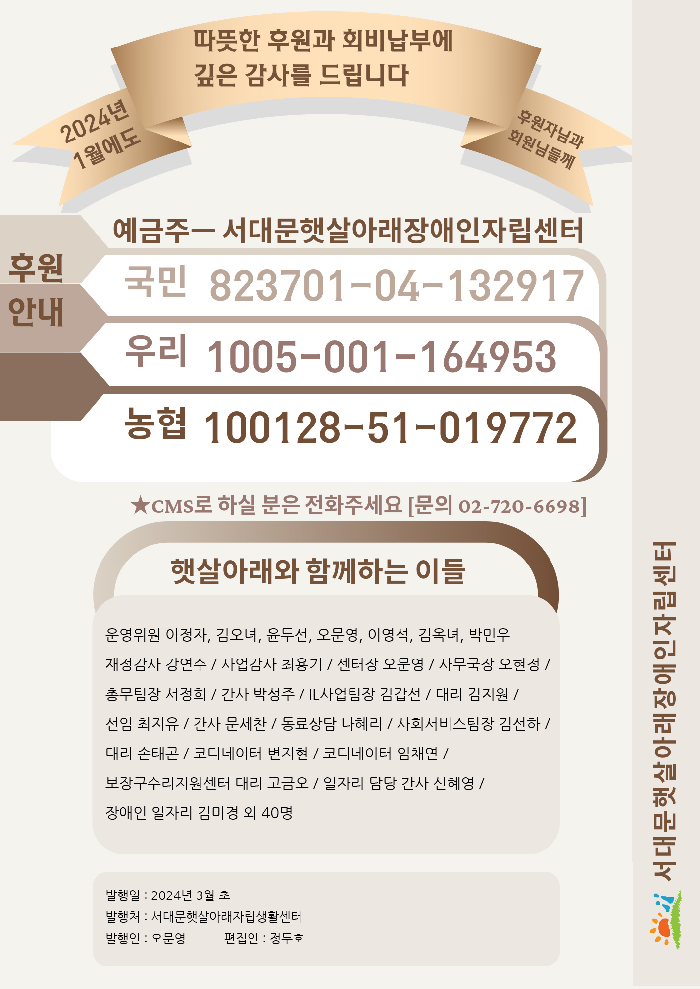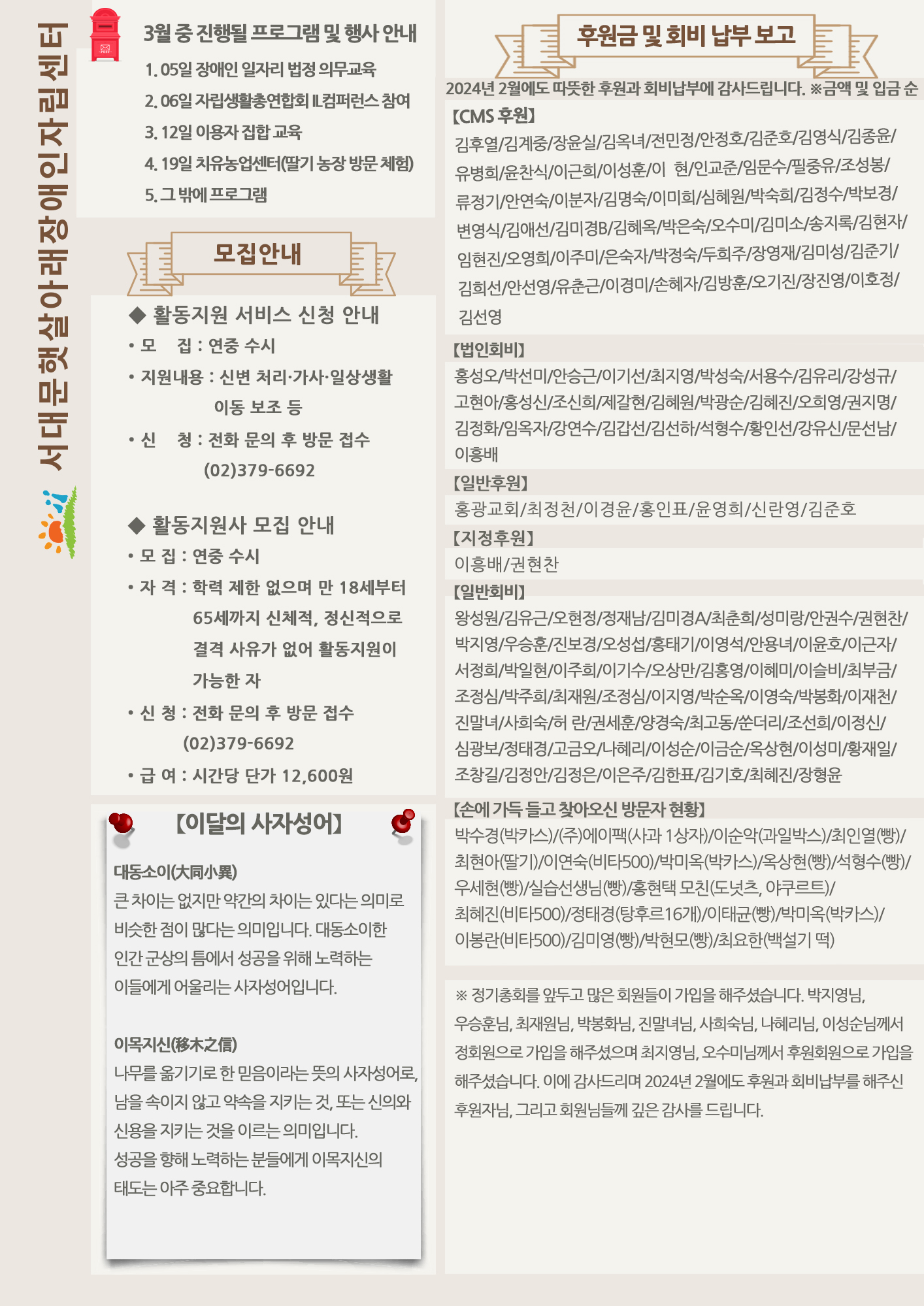 ¼´ë¹®ÇÞ»ì¾Æ·¡Àå¾ÖÀÎÀÚ¸³»ýȰ¼¾ÅÍ(ÀÌÇÏ ÇÞ»ì¾Æ·¡, ¼¾ÅÍÀå ¿À¹®¿µ)´Â ÀÚ¸³»ýȰ(Independent Living)ÀÇ À̳信 µû¶ó Àå¾ÖÀÎ ´ç»çÀÚ°¡ ¿î¿µÇÏ´Â Àå¾ÖÀαÇÀÍ¿ËÈ£´Üü·Î¼ Àü Àå¾Ö¿µ¿ªÀ» ´ë»óÀ¸·Î ¼ÒºñÀÚ Áß½ÉÀÇ ¼ºñ½º¸¦ Á¦°øÇϰí, Àå¾ÖÀÎÀÌ ÀÚ¸³»ýȰÇϱâ ÁÁÀº ȯ°æÀ» Á¶¼ºÇϸç, ¾Æ¿ï·¯ ¿ÏÀüÇÑ »çȸÂü¿©¿Í ÅëÇÕÀ» °¡´ÉÇϵµ·Ï ³ë·ÂÇÏ´Â ºñ¿µ¸® ¹Î°£´ÜüÀÔ´Ï´Ù.