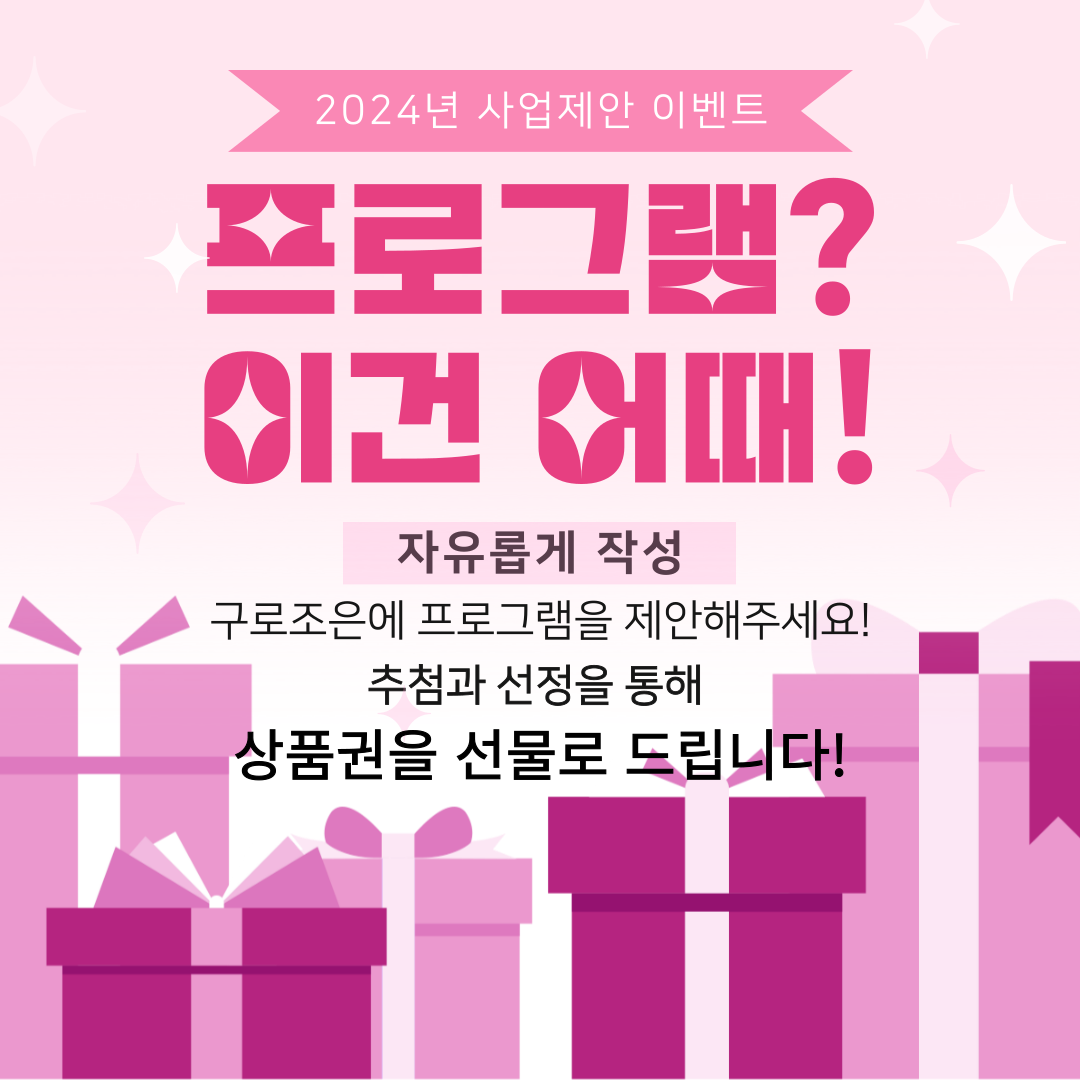Á¦¸ñ À̺¥Æ®) 2024³â ÇÁ·Î±×·¥ Á¦¾È À̺¥Æ®¸¦ °³ÃÖÇÕ´Ï´Ù. ÀÛ¼ºÀÚ ±¸·ÎÁ¶Àº ÀÛ¼ºÀÏÀÚ 2023-12-27 Á¶È¸¼ö 476 ±¸·ÎÁ¶Àº 2024³âµµ »ç¾÷ Á¦¾È À̺¥Æ®(12¿ù29ÀÏ ¿ÀÀü 10½Ã±îÁö)ÀÚÀ¯°Ô½ÃÆÇ¿¡ ÀÛ¼º