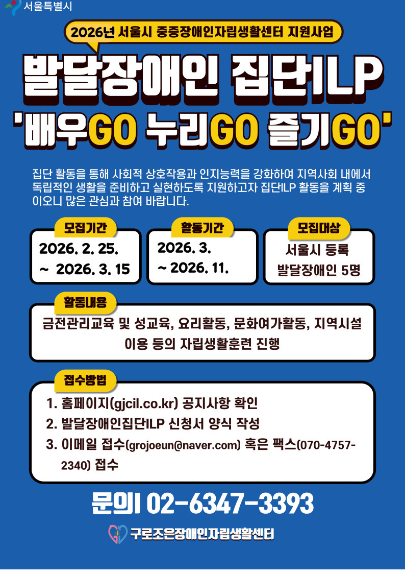 Á¦¸ñ ¹ß´ÞÀå¾ÖÀÎ Áý´Ü ILP '¹è¿ìGO, ´©¸®GO, Áñ±âGO' Âü°¡ÀÚ ¸ðÁý ¾È³» ÀÛ¼ºÀÏÀÚ 2026-02-24 ±¸·ÎÁ¶ÀºÀå¾ÖÀÎÀÚ¸³»ýȰ¼¾ÅÍ ¿î¿µ±¹Àå È«Áö°æÀÔ´Ï´Ù.Áö¿ª»çȸ³»¿¡¼ ¹ß´ÞÀå¾ÖÀÎ ´ç»çÀÚ°¡ ÀÚ¸³»ýȰ¿¡ ´ëÇÑ °áÁ¤·ÂÀ» °¡Áú¼ö ÀÖµµ·Ï ÀÚ¸³ÀÇÁö¸¦ °íÃëÇϰíÀÚ ¹ß´ÞÀå¾ÖÀÎ Áý´Ü ILP Âü°¡ÀÚ¸¦ ¸ðÁýÇÕ´Ï´Ù.¸¹Àº °ü½É°ú Âü¿© ºÎŹ µå¸®¸ç ¹®ÀÇ´Â (02-6347-3393) À¸·Î ¿¬¶ô ¹Ù¶ø´Ï´Ù. ÷ºÎÆÄÀÏ KakaoTalk_20260224_132121600.jpg ¹ß´ÞÀå¾ÖÀÎÁý´ÜILP Âü°¡½Åû¼ ¾ç½Ä.hwp