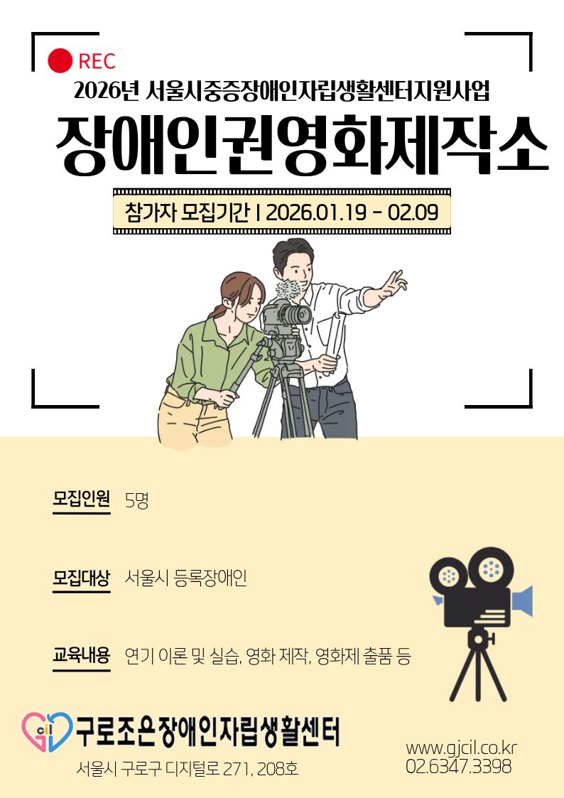 Á¦¸ñ 2026³â Àå¾ÖÀαǿµÈÁ¦ÀÛ¼Ò Âü°¡ÀÚ ¸ðÁý ¾È³» ÀÛ¼ºÀÏÀÚ 2026-01-22 ½Ã³ª¸®¿À ÀÛ¼º ¹× ¿¬±â, ¿µÈ Á¦ÀÛ Àü¹Ý¿¡ Âü¿©ÇÒ Àå¾ÖÀαǿµÈÁ¦ÀÛ¼Ò Âü°¡ÀÚ¸¦ ¸ðÁýÇÏ¿À´Ï ¸¹Àº °ü½É°ú ½Åû ºÎʵ右´Ï´Ù. ÷ºÎÆÄÀÏ Àå¾ÖÀαǿµÈÁ¦ÀÛ¼Ò Âü°¡½Åû¼.hwp