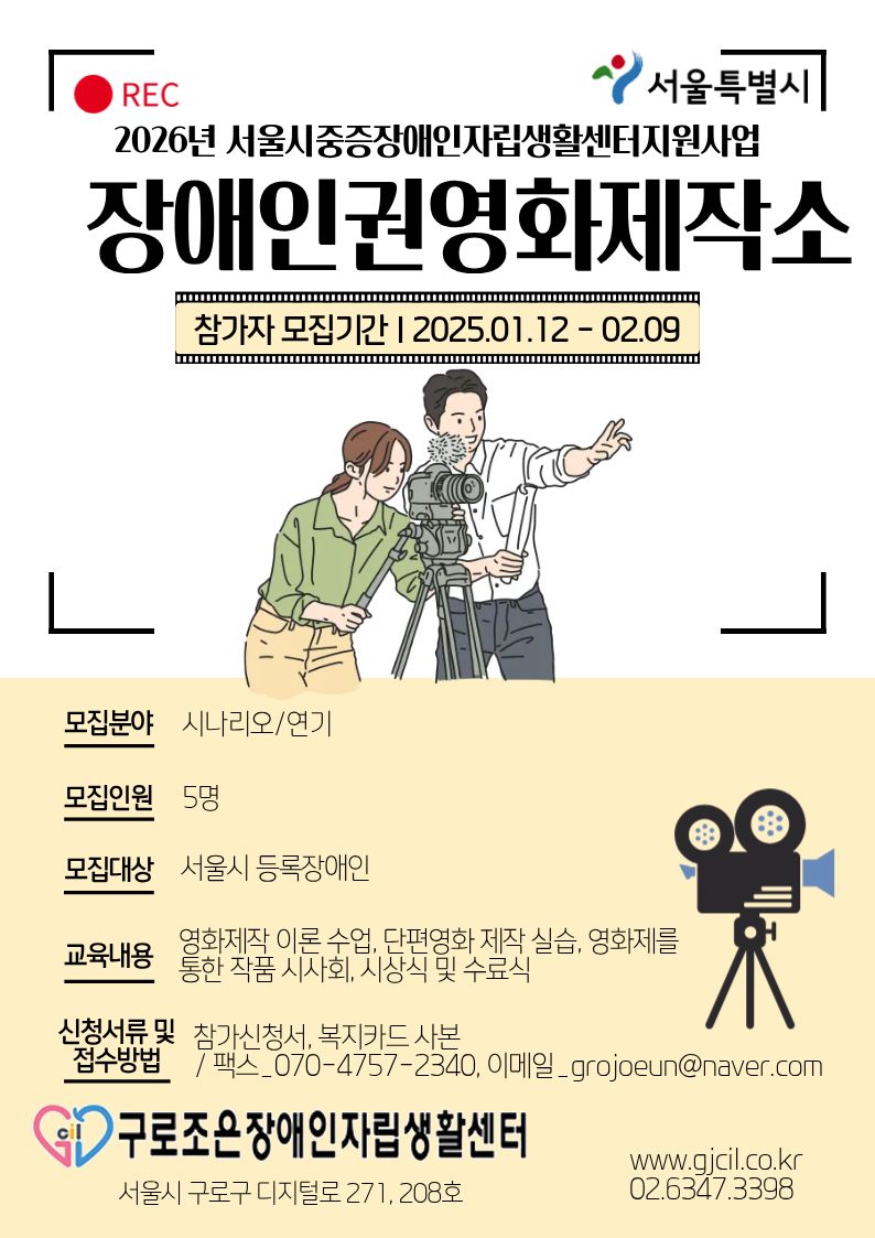 Á¦¸ñ 2026³â Àå¾ÖÀαǿµÈÁ¦ÀÛ¼Ò Âü°¡ÀÚ ¸ðÁý ¾È³» ÀÛ¼ºÀÏÀÚ 2026-01-22 ½Ã³ª¸®¿À ÀÛ¼º ¹× ¿¬±â, ¿µÈ Á¦ÀÛ Àü¹Ý¿¡ Âü¿©ÇÒ Àå¾ÖÀαǿµÈÁ¦ÀÛ¼Ò Âü°¡ÀÚ¸¦ ¸ðÁýÇÏ¿À´Ï ¸¹Àº °ü½É°ú ½Åû ºÎʵ右´Ï´Ù. ÷ºÎÆÄÀÏ Àå¾ÖÀαǿµÈÁ¦ÀÛ¼Ò Âü°¡½Åû¼.hwp