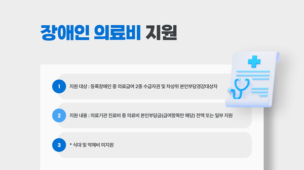 (2) Àå¾ÖÀÎ ÀÇ·áºñ Áö¿øÁö¿ø ´ë»ó : µî·ÏÀå¾ÖÀÎ Áß ÀÇ·á±Þ¿© 2Á¾ ¼ö±ÞÀÚ±Ç ¹× Â÷»óÀ§ º»ÀÎºÎ´ã°æ°¨´ë»óÀÚ (¸¸¼ºÁúȯÀÚ ¹× ¸¸ 18¼¼ ¹Ì¸¸ ¾Æµ¿ µî)Áö¿ø ³»¿ë : ÀÇ·á±â°ü Áø·áºñ Áß ÀÇ·áºñ º»Àκδã±Ý(±Þ¿©Ç׸ñ¸¸ ÇØ´ç) Àü¾× ¶Ç´Â ÀϺΠÁö¿ø .........................Ãâó : Çѱ¹Àå¾ÖÀνŹ® ¹«´ÜÀüÀç ¹× Àç¹èÆ÷ ±ÝÁö