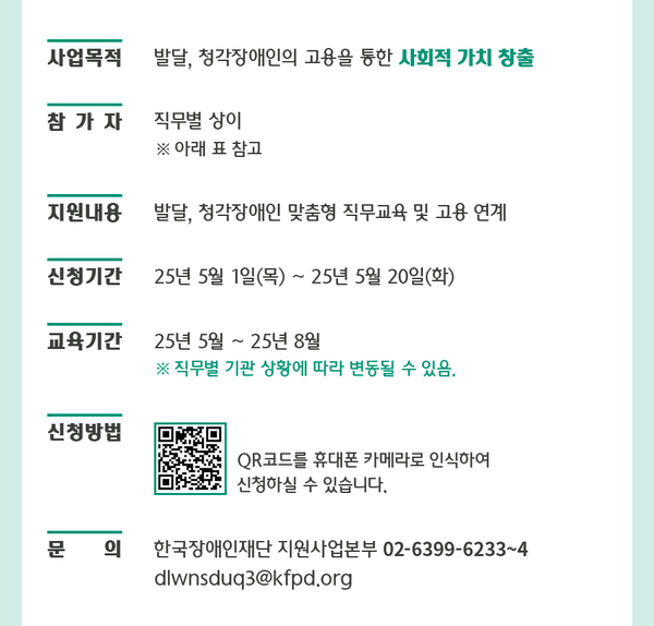 ¸ðÁý ³»¿ë (»çÁø : Çѱ¹Àå¾ÖÀÎÀç´Ü)±³À° ½ÅûÀº 5¿ù 1ÀϺÎÅÍ 20ÀϱîÁö °¡´ÉÇϸç, ±³À°Àº ¿À´Â 5¿ùºÎÅÍ 8¿ù »çÀÌ Á÷¹«º° ±â°ü ÀÏÁ¤¿¡ µû¶ó ÁøÇàµÈ´Ù. Âü°¡ ´ë»óÀº ¸¸ 19¼¼¿¡¼ 34¼¼ »çÀÌÀÇ ¹ß´ÞÀå¾ÖÀÎ ¶Ç´Â û°¢Àå¾ÖÀÎÀ¸·Î, °¢ Á÷¹« ºÐ¾ßº°·Î ¼ÒÁ¤ÀÇ ÀοøÀÌ ¼±¹ß .........................Ãâó : Çѱ¹Àå¾ÖÀνŹ® ¹«´ÜÀüÀç ¹× Àç¹èÆ÷ ±ÝÁö