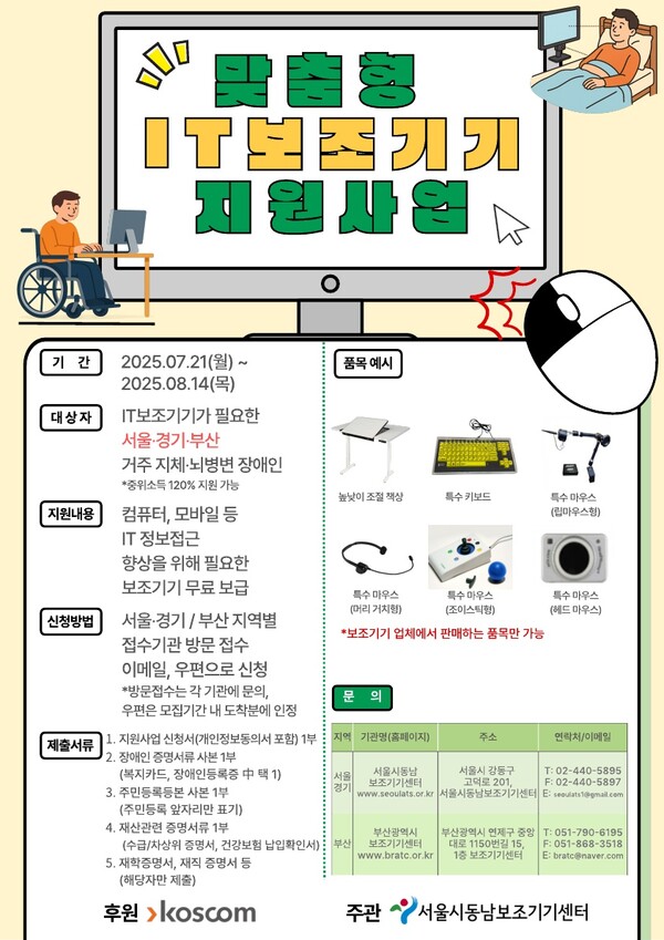 ¼¿ï½Ãµ¿³²º¸Á¶±â±â¼¾ÅͰ¡ ÄÚ½ºÄÞ°ú ÇÔ²² ÁøÇàÇÏ´Â ¡®Àå¾ÖÀÎÀ» À§ÇÑ ¸ÂÃãÇü ITº¸Á¶±â±â Áö¿ø»ç¾÷¡¯ Æ÷½ºÅÍ. »çÁø=¼¿ï½Ãµ¿³²º¸Á¶±â±â¼¾ÅÍ Á¦°ø¼¿ï½Ãµ¿³²º¸Á¶±â±â¼¾ÅͰ¡ 2025³â ÄÚ½ºÄÞ°ú ÇÔ²² ¡®Àå¾ÖÀÎÀ» À§ÇÑ ¸ÂÃãÇü ITº¸Á¶±â±â Áö¿ø»ç¾÷¡¯¸¦ ½Ç½ÃÇÑ´Ù.»ç¾÷Àº Àå¾ÖÀÎ °³°³ÀÎÀÇ Æ¯¼º°ú Çʿ信 ¸Â´Â ITÁ¢±Ù º¸Á¶±â±â¸¦ ¹«·á º¸±ÞÇØ Àå¾ÖÀÎÀÇ »îÀÇ ÁúÀ» Çâ»óÇÏ°í »çȸ Ȱµ¿ Âü¿©¸¦ Àû±ØÀûÀ¸·Î Áö¿øÇÏ´Â °ÍÀ» ¸ñÇ¥·Î Çϰí ÀÖ´Ù. »ç¾÷À» ÅëÇØ Àå¾ÖÀÎÀÇ Á¤º¸ Á¢±Ù¼ºÀ» ³ôÀÌ°í µðÁöÅÐ »çȸ Âü¿©°¡ È®´ëµÉ °ÍÀ¸·Î ±â´ëÇϰí ÀÖ´Ù.½Åû´ë»óÀº ITÁ¢±Ù º¸Á¶±â±â°¡ ÇÊ¿äÇÑ ¼¿ï, °æ±â, ºÎ»ê °ÅÁÖ µî·Ï ³úº´º¯¡¤Áöü Àå¾ÖÀÎ ....................